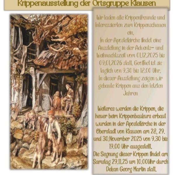 Unsere Ortsgruppen haben in den letzten Wochen und Monaten wieder fleißig in ihren Werkstätten gearbeitet und gebastelt. Ihre gelungenen Krippen stellen sie in der Adventszeit wiederum aus. Die detalierten Uhrzeiten zu den Ausstellungen finden Sie hier: